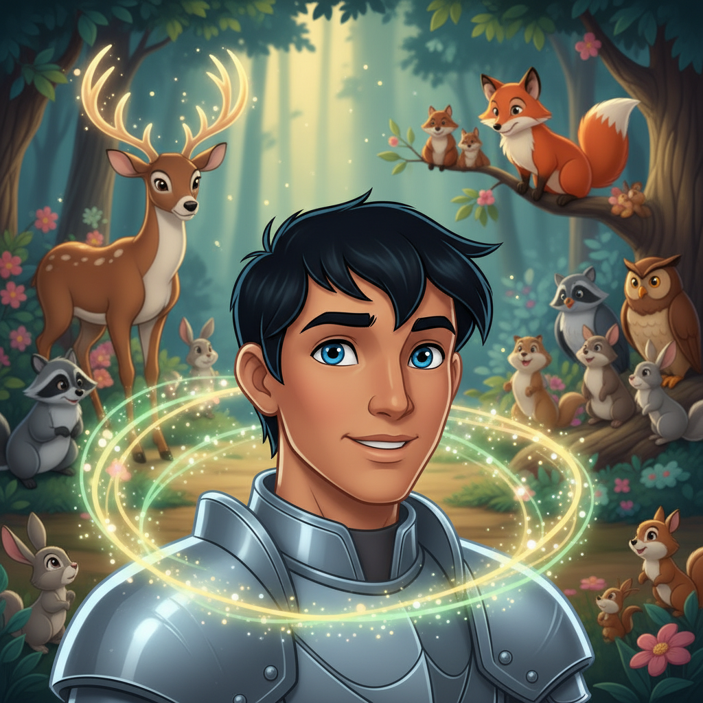 En un reino bañado por la luz del sol y salpicado de flores silvestres, vivía un joven caballero llamado Reno. A pesar de su corta edad, Reno poseía un corazón valiente y una cabellera tan negra como la noche, contrastando con sus ojos de un azul profundo como el cielo de verano. Su piel, de un tono medio y saludable, a menudo lucía un leve rubor por sus incansables aventuras. A diferencia de otros niños, Reno tenía un don extraordinario: la habilidad de comprender y hablar con todas las criaturas del reino animal. Este secreto, guardado celosamente, era su mayor tesoro y la fuente de sus más grandes hazañas. Un día, mientras paseaba por los extensos jardines del castillo, escuchó un murmullo inusual proveniente del Bosque Susurrante, un lugar conocido por sus árboles antiguos y sus misterios. Las ardillas corrían frenéticamente, los pájaros cantaban melodías de alarma y hasta los conejos parecían tensos. Reno, intrigado y con un instinto protector, se adentró en el bosque, guiado por las voces urgentes de sus amigos animales. El aire se volvía más denso, y las sombras danzaban a su alrededor como guardianes silenciosos de antiguos secretos. El primer encuentro de Reno fue con un viejo búho, posado en la rama más alta de un roble centenario. '¡Joven caballero!', ululó el búho con voz ronca, 'El Corazón del Bosque, la gema que le da vida a todo, está perdiendo su brillo. Una sombra siniestra se cierne sobre nosotros y el bosque se marchitará si no actuamos pronto.' Reno escuchó atentamente, sintiendo la gravedad de la situación a través de la angustia en las palabras del búho. Su corazón de niño se llenó de determinación para ayudar. Siguiendo las indicaciones del búho, Reno se dirigió hacia el centro del bosque, donde se decía que se encontraba la cueva del Corazón del Bosque. En su camino, se encontró con un grupo de zorros astutos que le advirtieron sobre trampas ocultas y caminos engañosos. Reno, usando su don, pudo dialogar con ellos, entendiendo sus miedos y agradeciéndoles su valentía. Les prometió que no descansaría hasta devolver la luz al bosque, fortaleciendo así su determinación. Al llegar a la entrada de la cueva, Reno se encontró con un oso imponente, guardián de la entrada. El oso gruñó, bloqueando su paso. 'Nadie entra aquí sin el permiso de la naturaleza,' rugió con fuerza. Reno, sin temor, se arrodilló e inclinó la cabeza, hablando con respeto al gran animal. Le explicó su propósito y la urgencia de su misión. La nobleza en las palabras de Reno y su sincero deseo de proteger el bosque conmovieron al oso, quien finalmente cedió el paso.